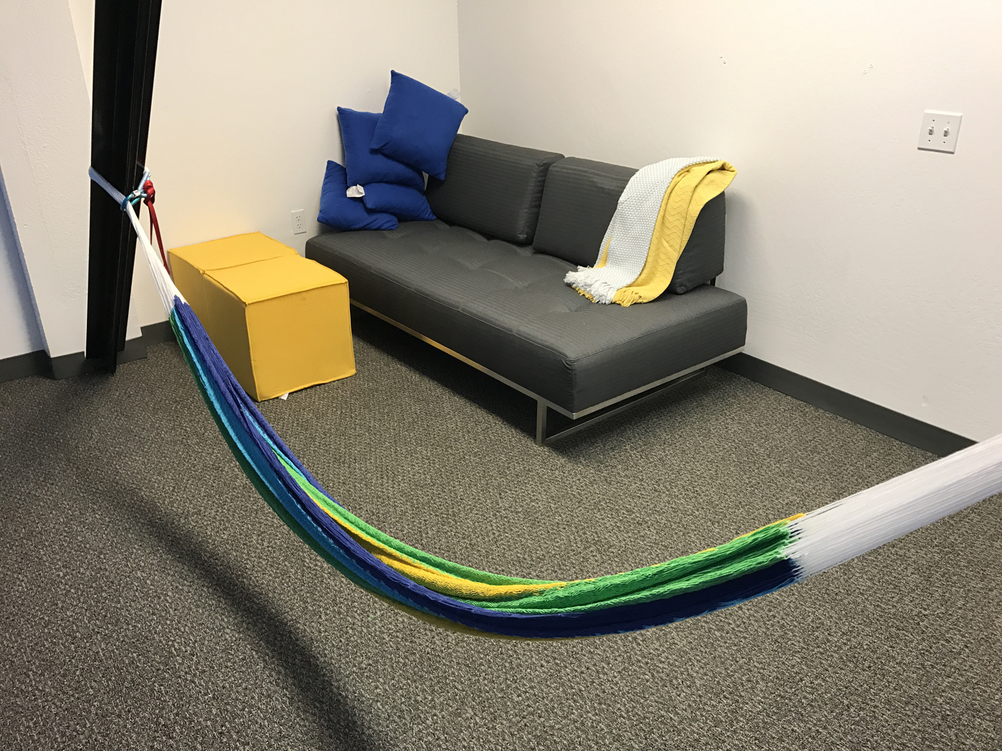 今はハンモックとソファーのあるくつろぎ部屋っぽくなってますが、こっちの人は集中して仕事してサッと帰るスタイルの人が多いので、個人的には近いうちにホワイトボードが入ってきてミーティングルームになってそうと思ってます。
