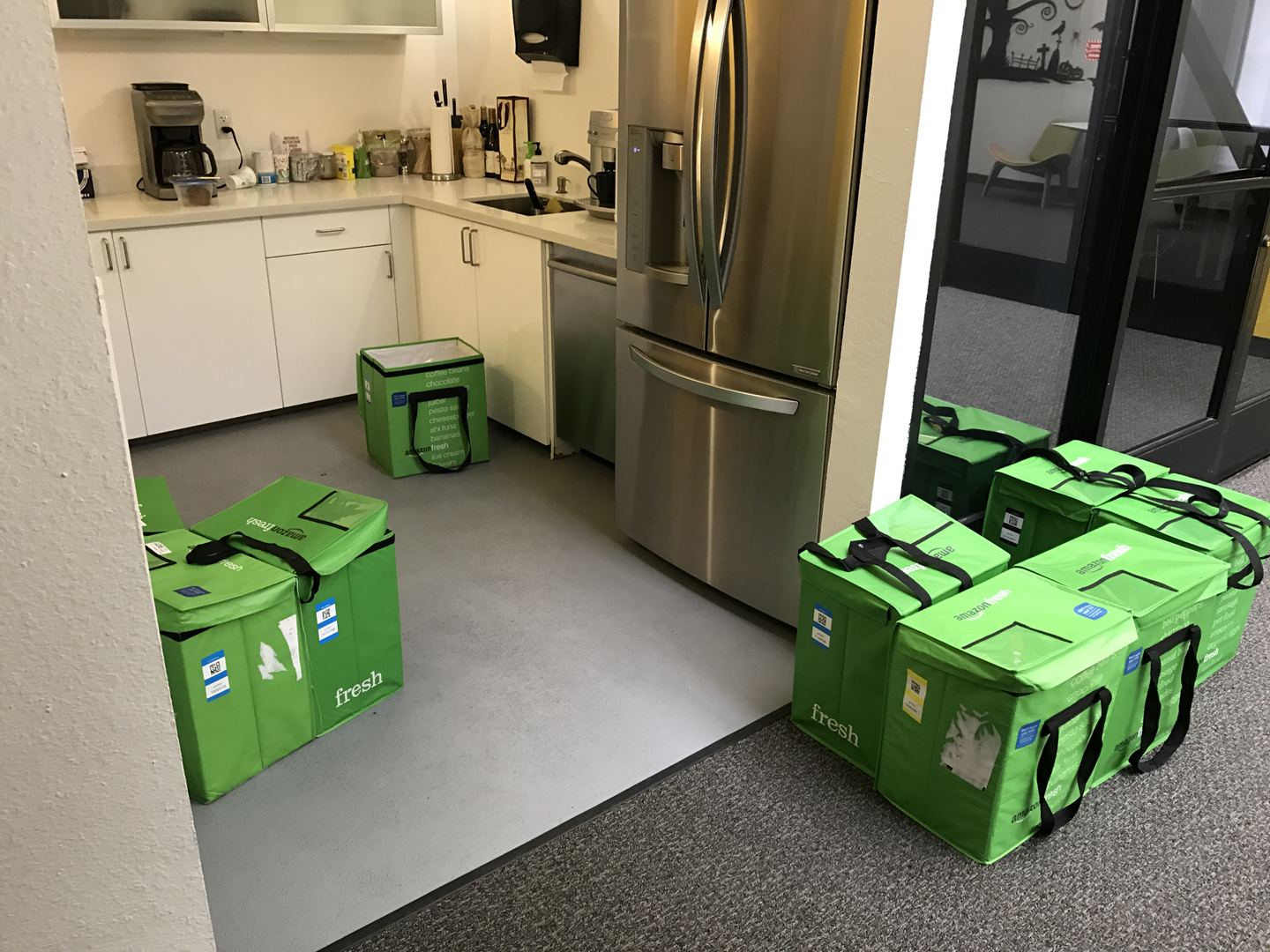 撮影時、ちょうどAmazon freshの便が届いたばかりで、緑色のボックスが積まれています。