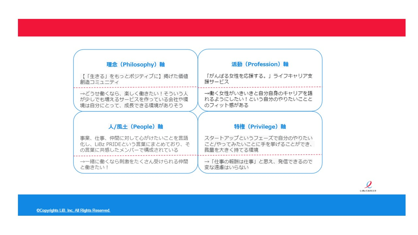 商品・サービスの魅力を構造的にとらえる際に用いられるマーケティングの4構造である4Pを会社に置き換えて、構造的に考える方法です。人によって軸は様々だと思いますので、ご参考までに私の軸をご紹介します。(※あくまで私の観点で記載しております)