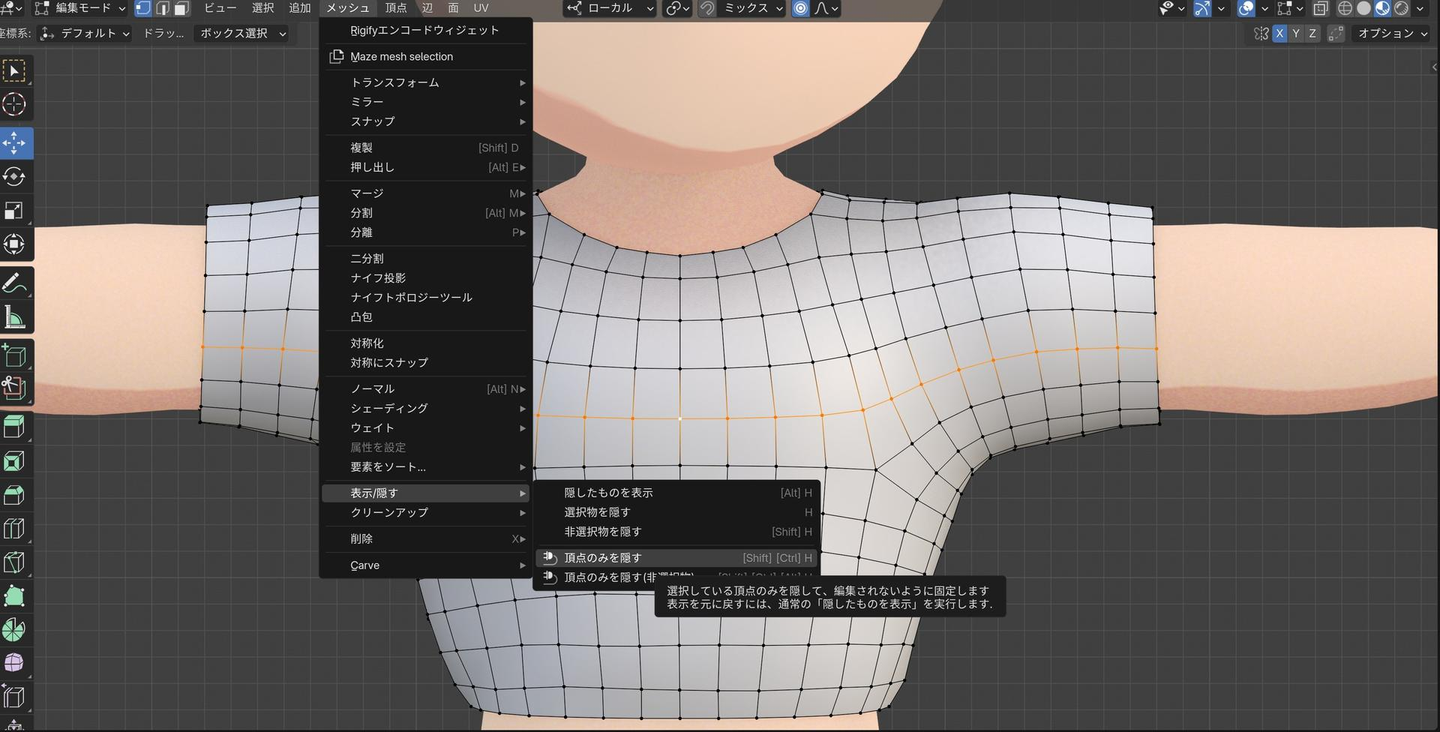 隠したい(選択できなくする)頂点を選択したら上部メニューのメッシュから表示/隠すの頂点のみを隠すを選択します。