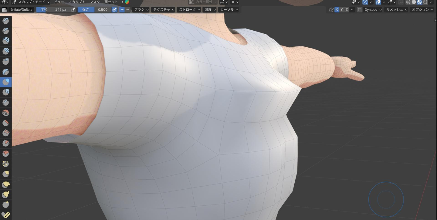 ブラシをインフレートにして、隠した頂点とその付近を盛り上げてみました。