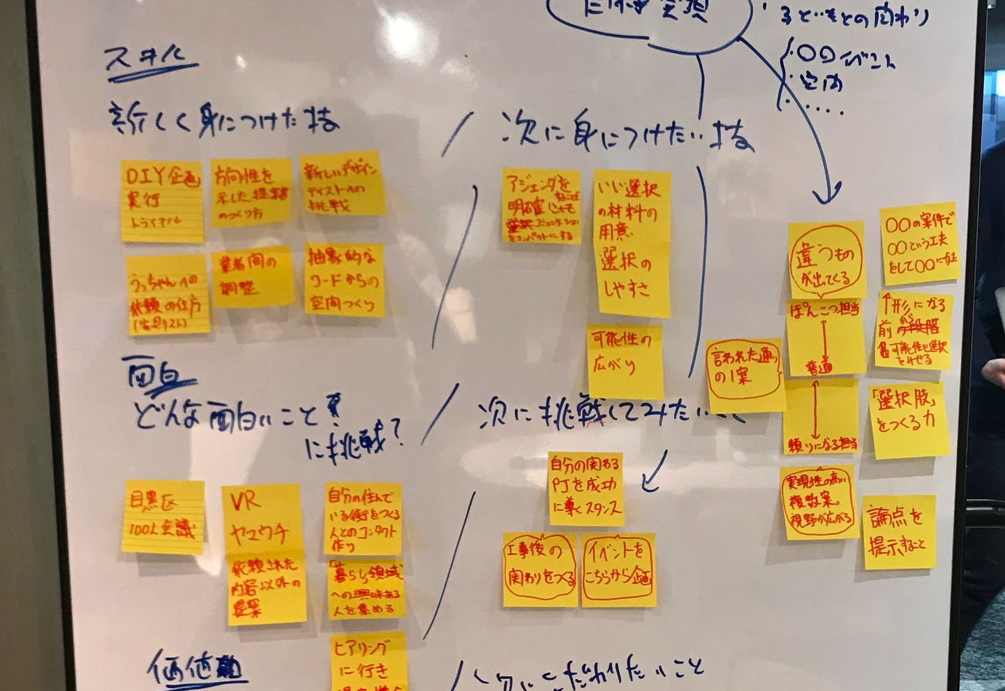 話題もニーズや状況によって色々あってよく、目標達成していく上でのモヤモヤ、困っていること、業務上での気づき、チームが良くなるためのアイデア、マネジャーへのお願い、個人的トピック、将来キャリアなど、自由に話したいトピックを選んで話せる時間をきちんと確保しておくというのは、組織運営としても大事そう。忙しい中でも、自由に話せる時間が確保されているからこそ、その時々で必要な相談をして、タイムリーに仕事に活かすことができるのが理想です。また、仕事の進め方のアドバイスのタイミングがよければ、それを活かせる機会も自然と増えてくると思います。この半年では、地域と関わりのある仕事をしていきたいというメンバーに、DIYをプロジェクトに組み込むことを提案。最終的にお客様の理解も得られて、住民参加で壁塗り木工DIYを実現することができたりしました。なので、案件の話しをしてはいけないわけでもなく、状況をお互いに整理しながら工夫できそうな選択肢を増やす感じが近いのかなと思います。そもそも、評価面談の場で半年前のフィードバックをもらっていても、それまでの仕事がもったいなすぎる!というのが、1on1が生まれた理由とのこと。