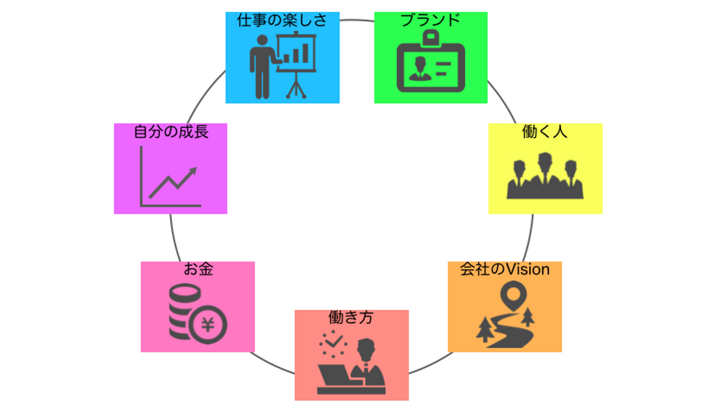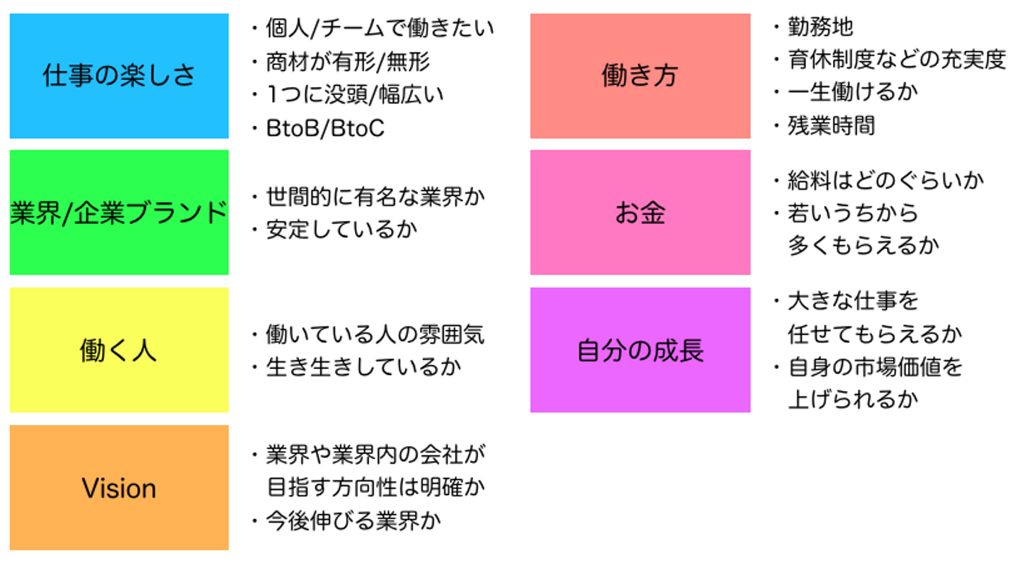 友人や説明会であった就活生、大学のキャリアセンター、先輩など多くの人の話を聞き、新卒が「働く上で大切にする条件」を7種類に分類しました。