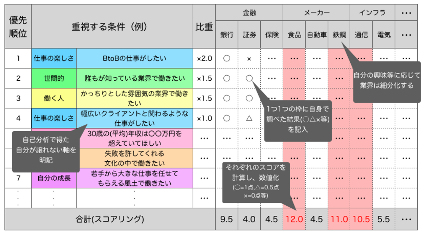 これを参考に自己分析・他己分析等をもとに譲れない条件を洗い出し、業界に当てはめながら諸条件と照らし合わせてスコアリングを行います。