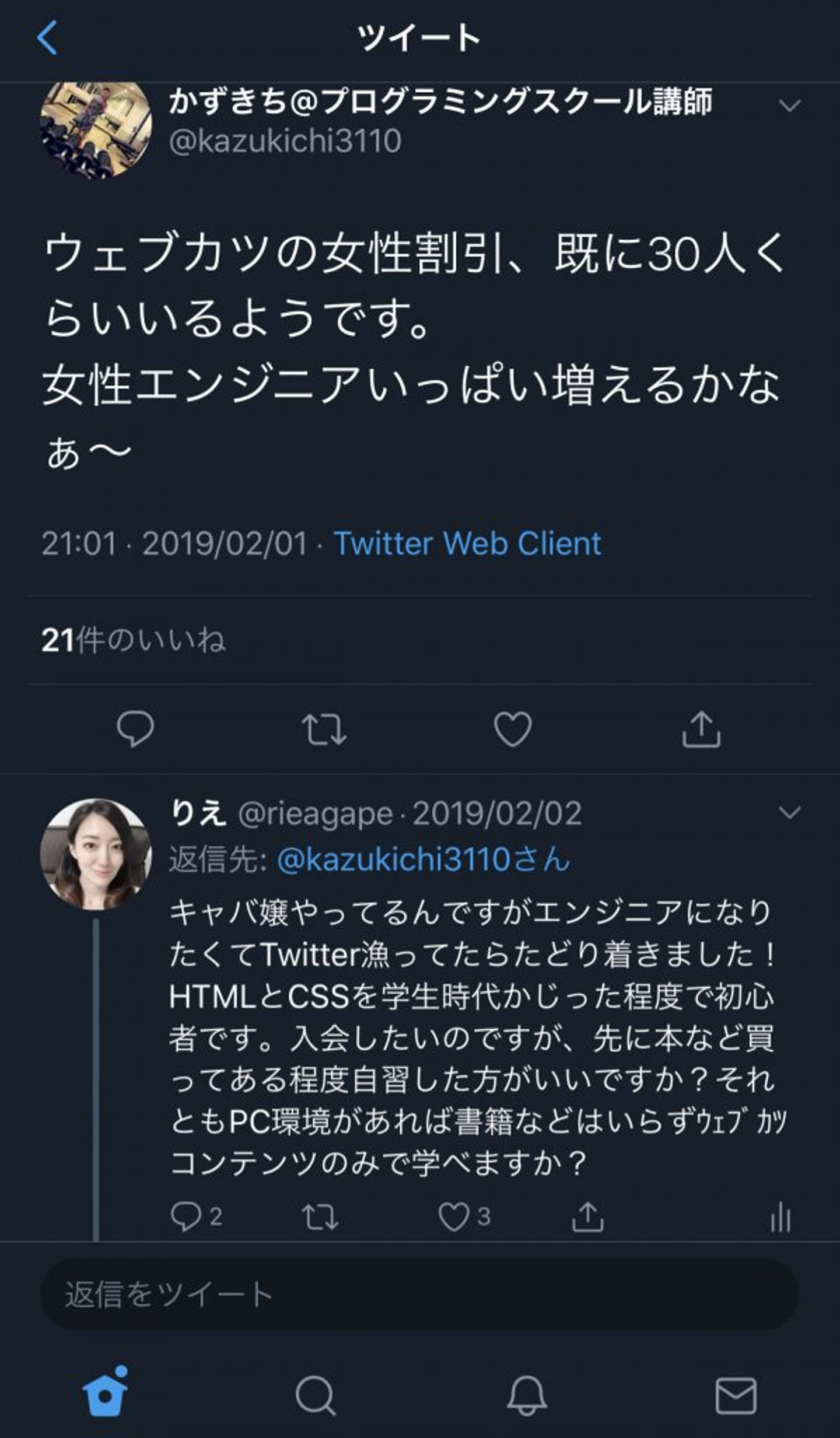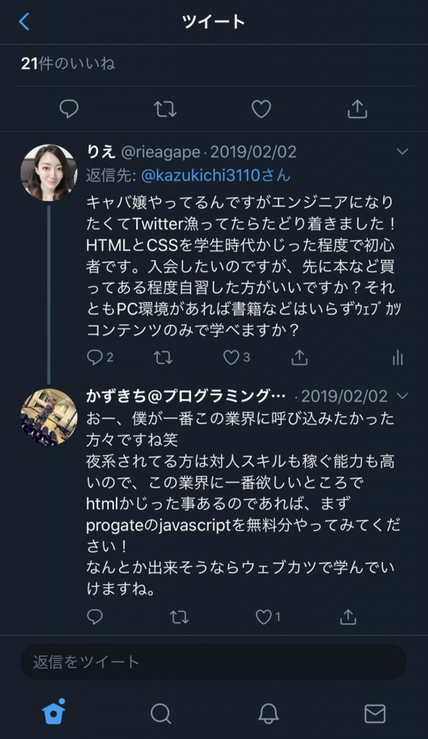 だいたい2時間くらい、Twitterでエンジニアの情報を読み漁っていて、心は半分「とりあえず、オンラインサロン入ってみようかな〜」と考えていたときに、かずきちさんという方のTwitterを見つけました。