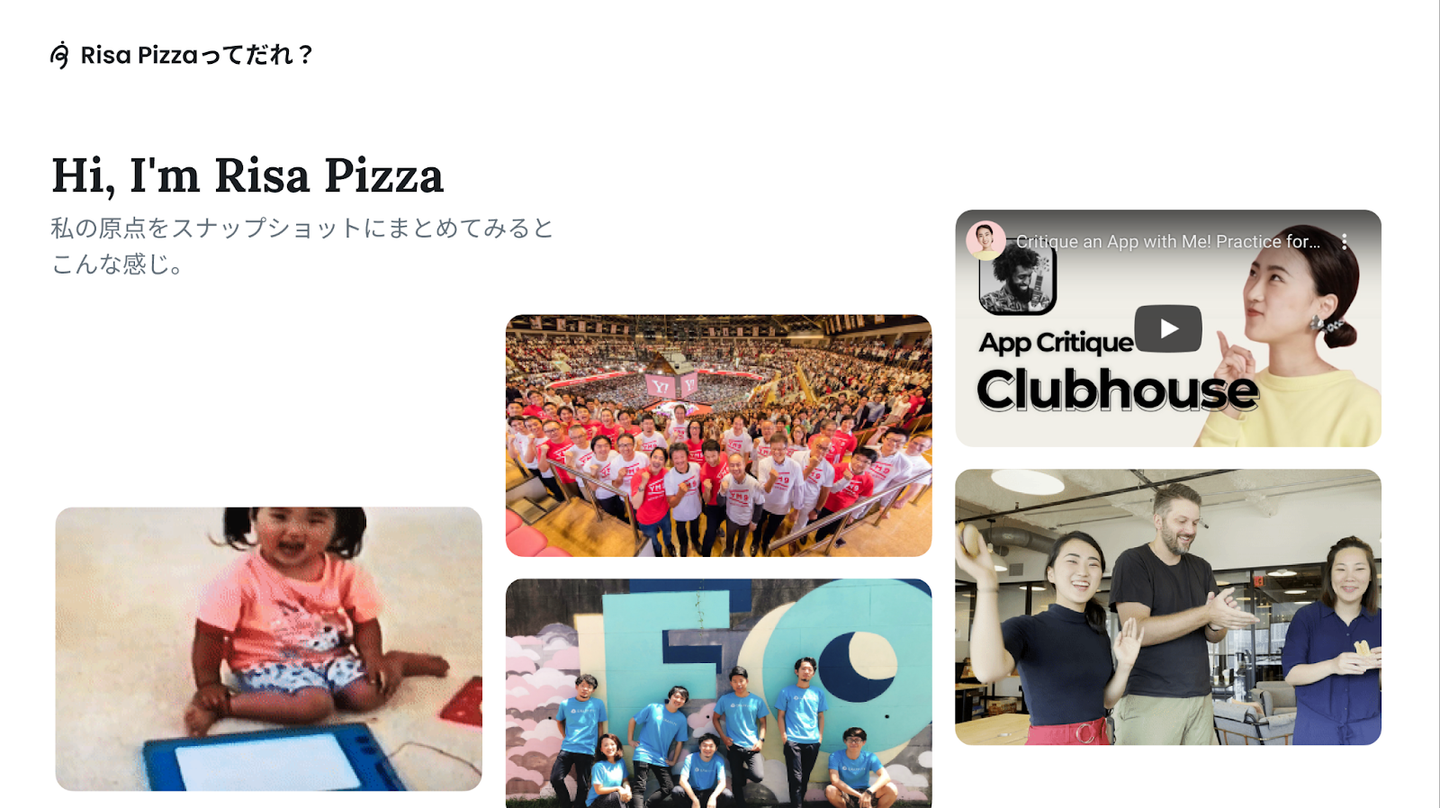 慶應義塾大学環境情報学部卒業後、UXデザイナーとしてYahoo! JAPANに入社。約2年間ヤフー乗換案内アプリを担当。2018年にARのスタートアップ、Graffityに転職してペチャバトをデザイン。2019年にサンフランシスコのスタートアップ、All Turtlesに入社。2020年に6年間の遠距離恋愛を経てアメリカ人の夫と結婚し、無職の状態でロサンゼルスに移住。現地で激動の就活の後、Communityに入社。後にMothershipに転職し現在は Principal DesignerとしてNetflixに所属。Risa PizzaとしてYouTubeデビューを果たす。