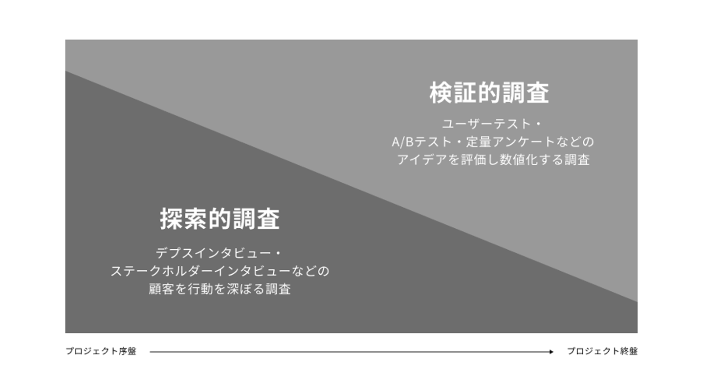 プロジェクト中期は探索的&検証的調査を両方合わせた調査を行います。